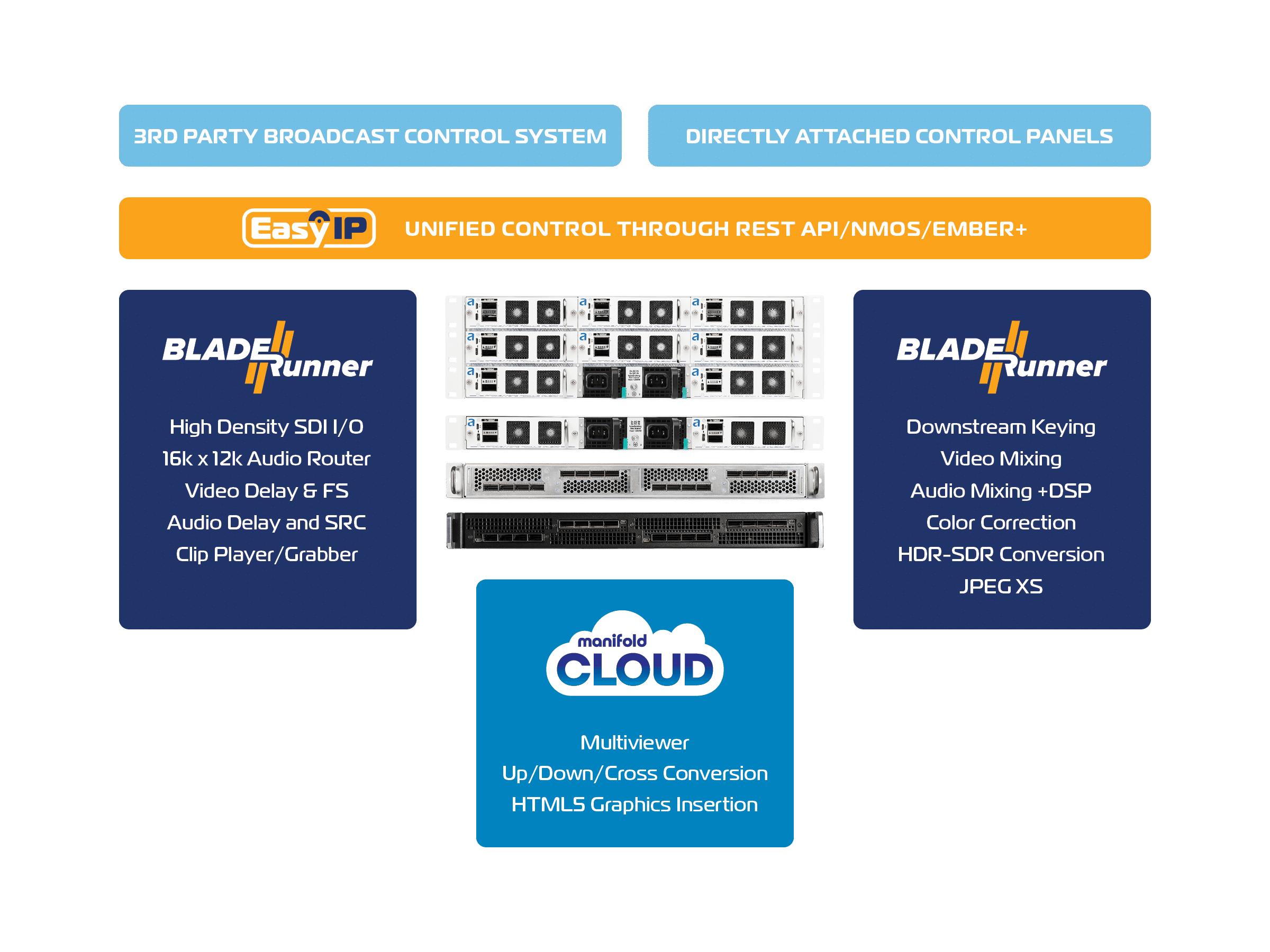 EASY-IP also incorporates manifold CLOUD, the industry’s highest density ultra-low-latency multiviewer, into the bundle. manifold CLOUD handles demanding live sports, entertainment and news productions while simultaneously providing benefits of scalability, resiliency, quick deployment and unified control. Capable of up to 1.6 Tbps of processing in one RU, manifold CLOUD utilizes the power of COTS FPGA accelerators available from multiple IT vendors. With its unique distributed architecture any source can be displayed on any output in any size with virtually no limitations with guaranteed ultra-low latency end-to-end. In addition, every UHD source in manifold generates a high-quality 1080P proxy available as a discrete ST 2110 source.