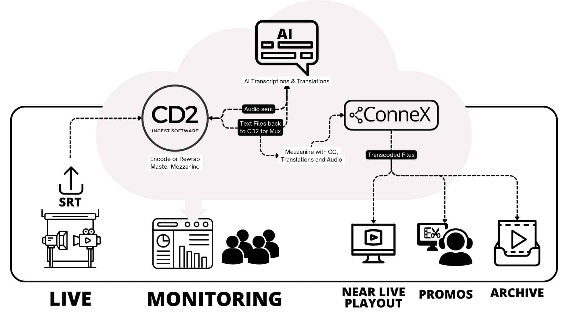 The system is designed for flexibility, ensuring efficient and scalable media processing, from live caption decoding to multi-server content distribution. Its live AI captions enable real-time captioning, ensuring that media content is instantly accessible to a wider audience. Additionally, its fast-turnaround translation capabilities break language barriers, offering near-live translations into multiple languages.