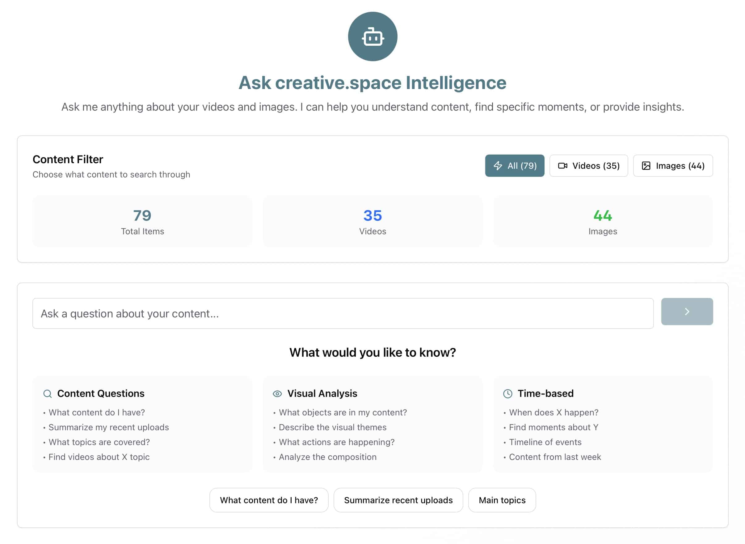 - Natural Language Access: A single prompt box connects creatives to their entire asset library, enabling searches that understand nuance, mood, and intent.