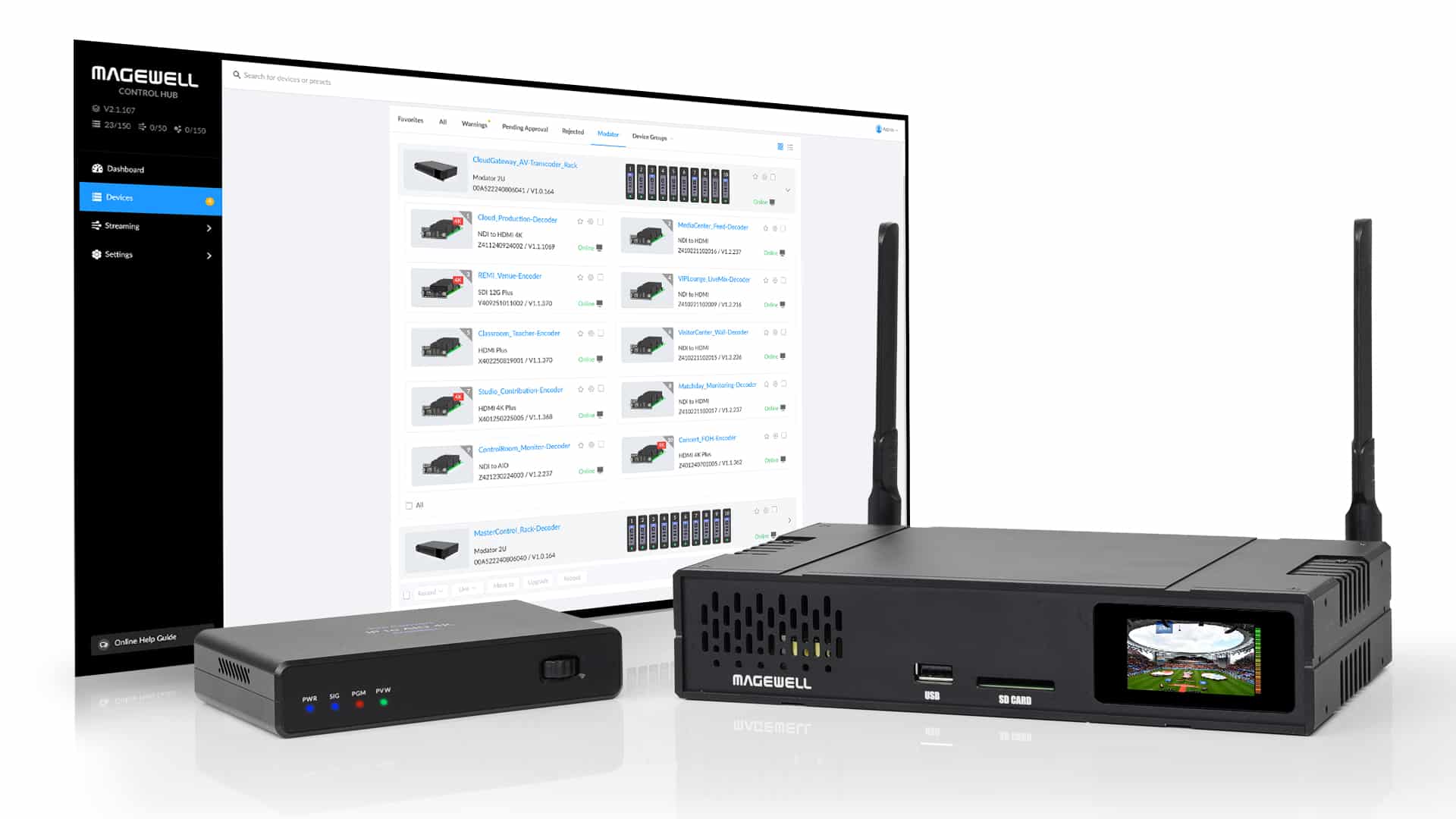 Providing centralized configuration and control of multiple Magewell streaming and IP conversion solutions across one or more locations, the Control Hub software has become the core of Magewell conversion environments. Demonstrations will showcase a new version of Control Hub that features an enhanced user interface to easily accommodate large deployments with multiple Modator rackmount frames. The Modator platform brings the reliability and extensive functionality of Magewell’s standalone encoding and decoding devices to a scalable, high-density form factor, with each Modator 2U chassis hosting up to 10 hot-swappable modules.