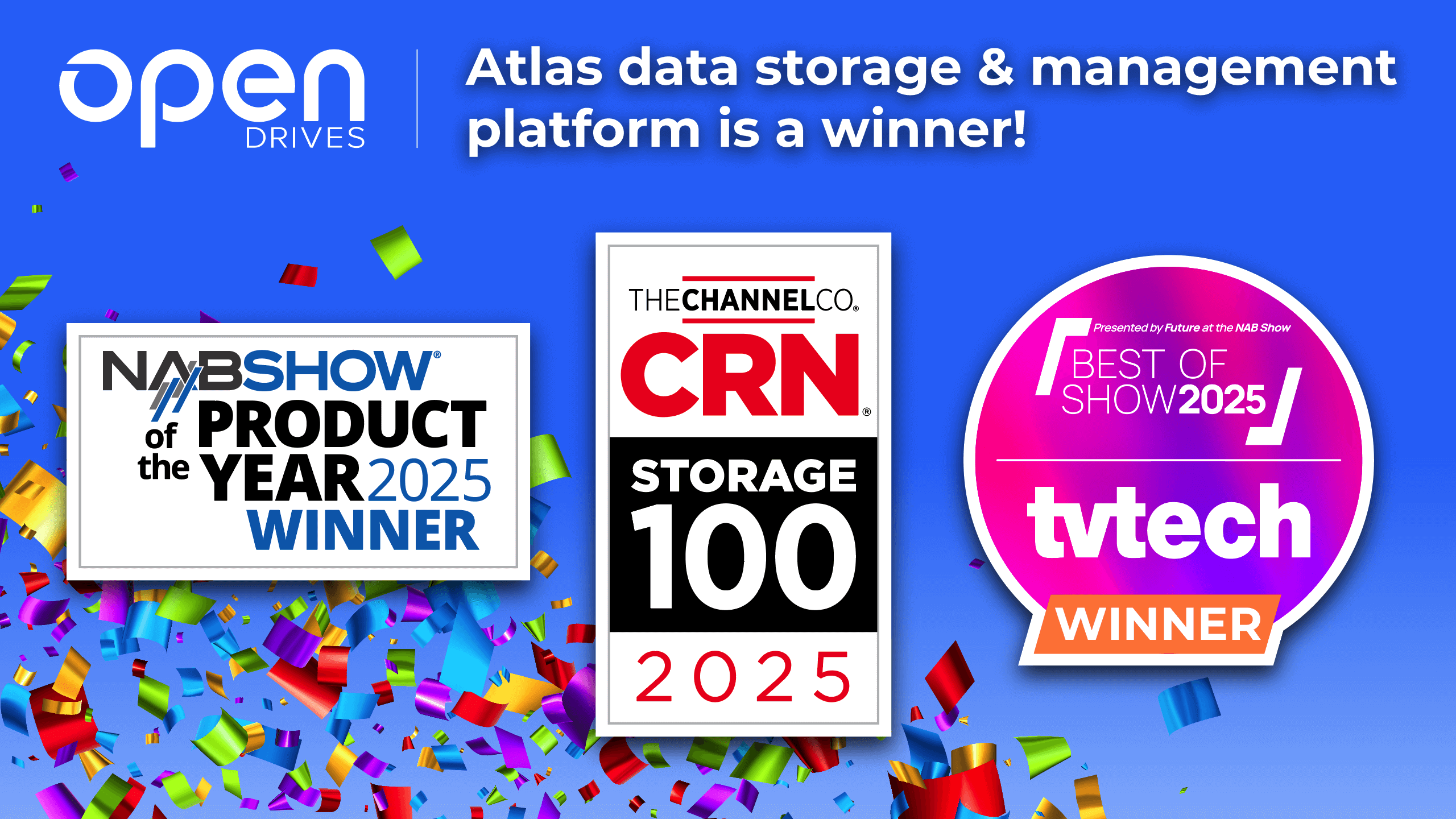 Los Angeles, CA – April 29, 2025 – OpenDrives, Inc., a leading provider of software-defined data storage and data services solutions, is proud to announce that its Atlas software-defined storage platform earned three industry awards this month, two of which were presented at the 2025 NAB Show. The honors reflect OpenDrives’ continued leadership in high-performance, cost-predictable, and reliable storage for media and entertainment and enterprise workflows.